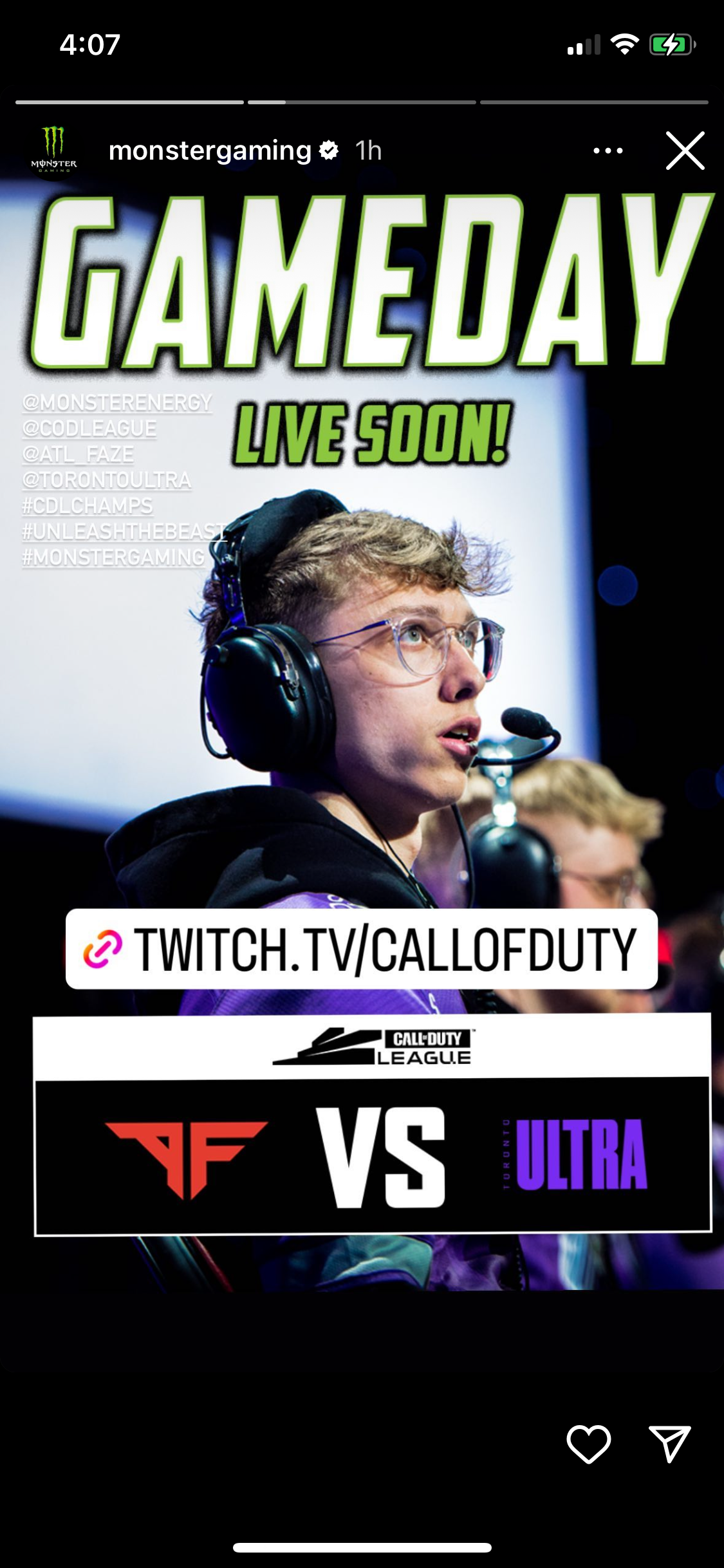 During my internship with Monster Energy, I worked with my mentor, the marketing team, and the creative team to create social media templates for gaming events such as CDL (Call of Duty League) and ESL Cologne (Counter-Strike). In these templates, team logos, scores, and images can be switched out by pushing a few buttons, making posting on social media while at events quick and efficient. Here are the templates for CDL...